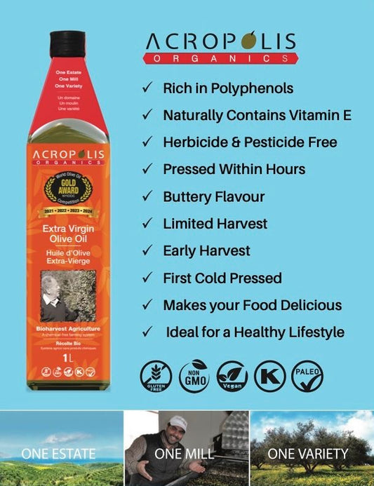 Acropolis Organics Bioharvest Extra Virgin Olive Oil 1LRegular price $63.99 CADRegular priceUnit price per-