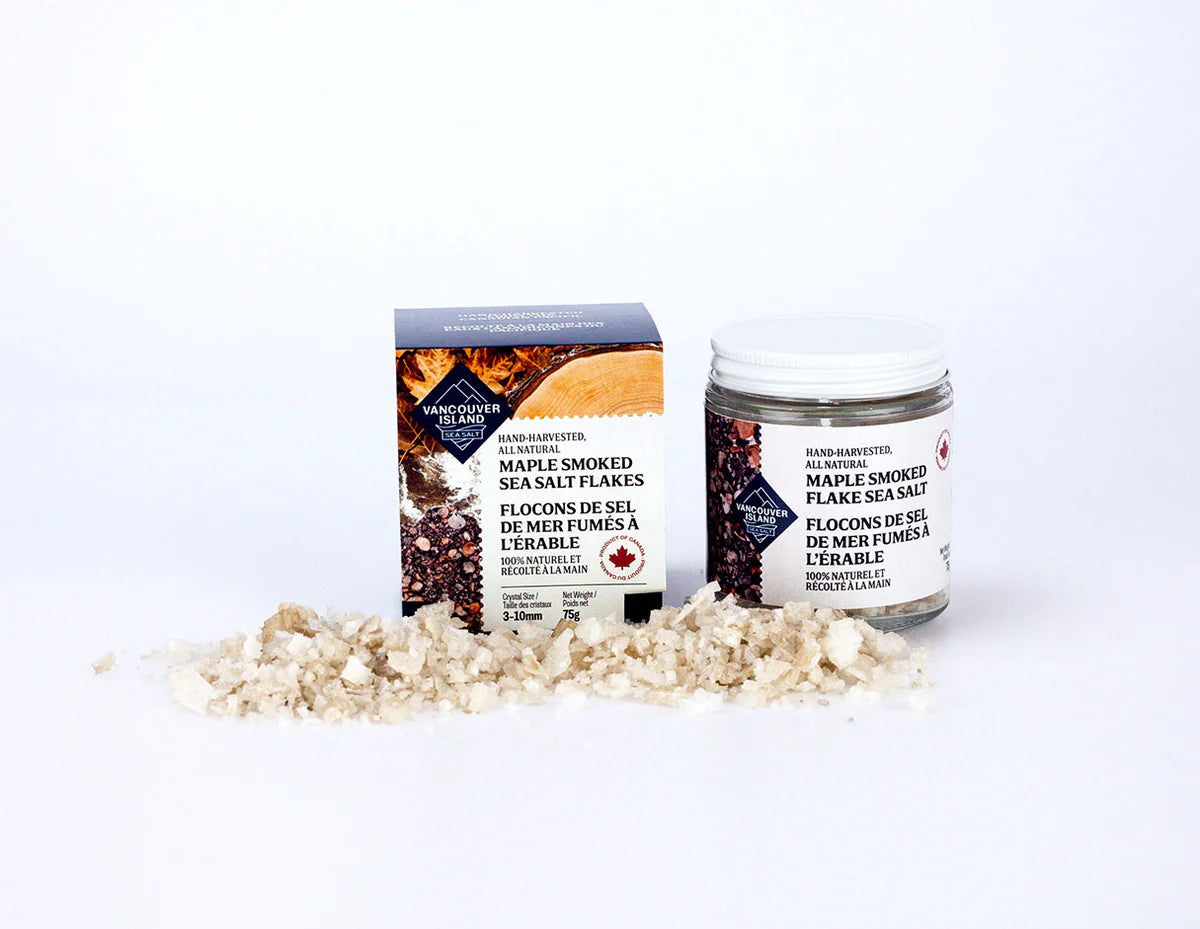 Our Maple Smoked Sea Salt Flakes are hand-harvested from the cold, clear waters of the Canadian Pacific before being carefully smoked for several days in small batches using real maple wood.